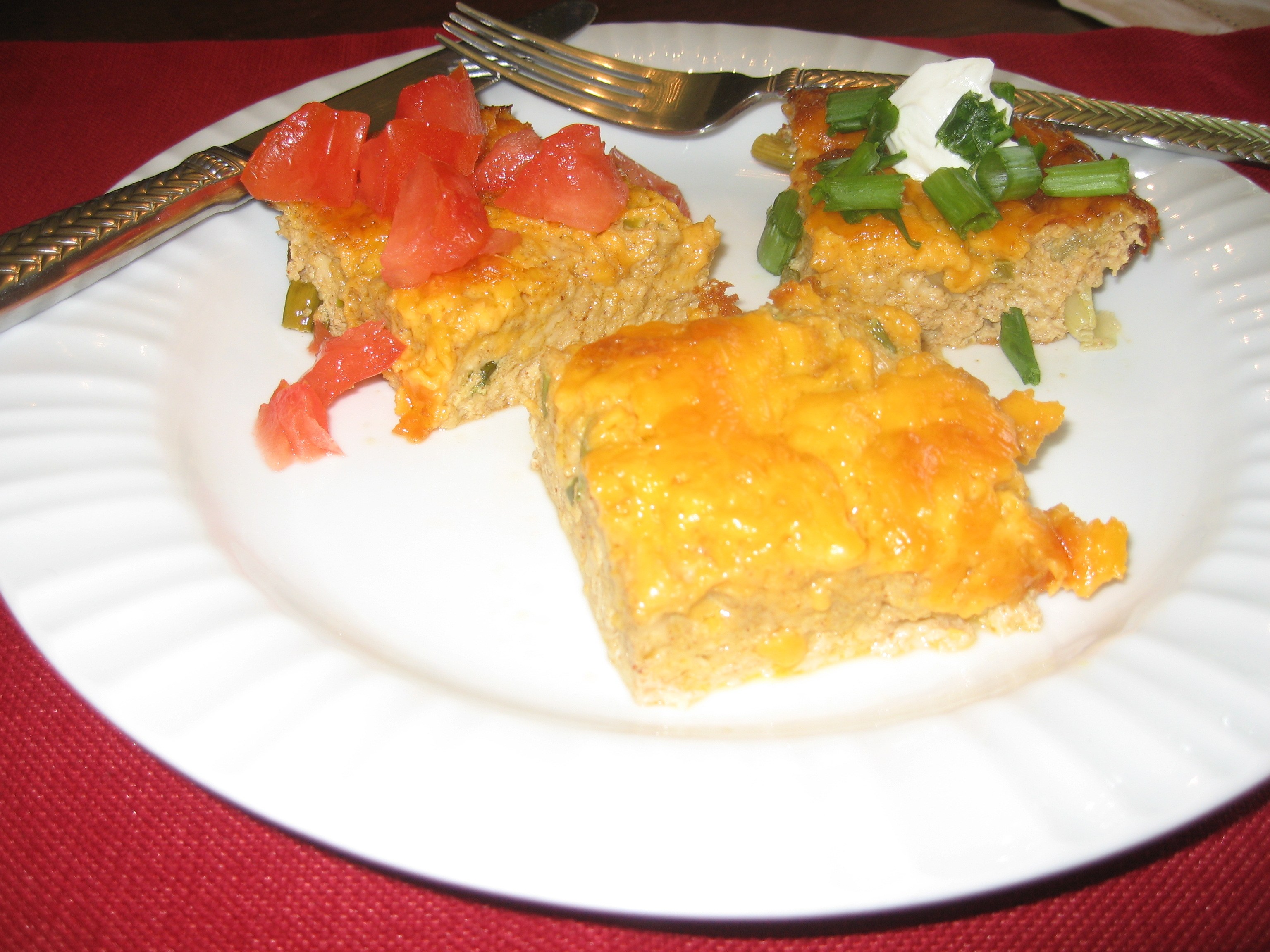 Preheat oven to 350 F. Butter 2 8″ square baking dishes. Whisk 1st 4 ingredients together. Whisk in milk. Whisk in Monteray Jack cheese and onions. Divide mixture between 2 baking dishes and sprinkle each with the cheddar cheese. Bake until tops are light brown and puffed about 45 mins. Cool slightly so that they will stay in a form and not fall apart(if to hot they will fall apart when you take it out) Cut into squares and serve. Serve by itself or garnish with fresh tomatoes, salsa, sour cream or green onions.